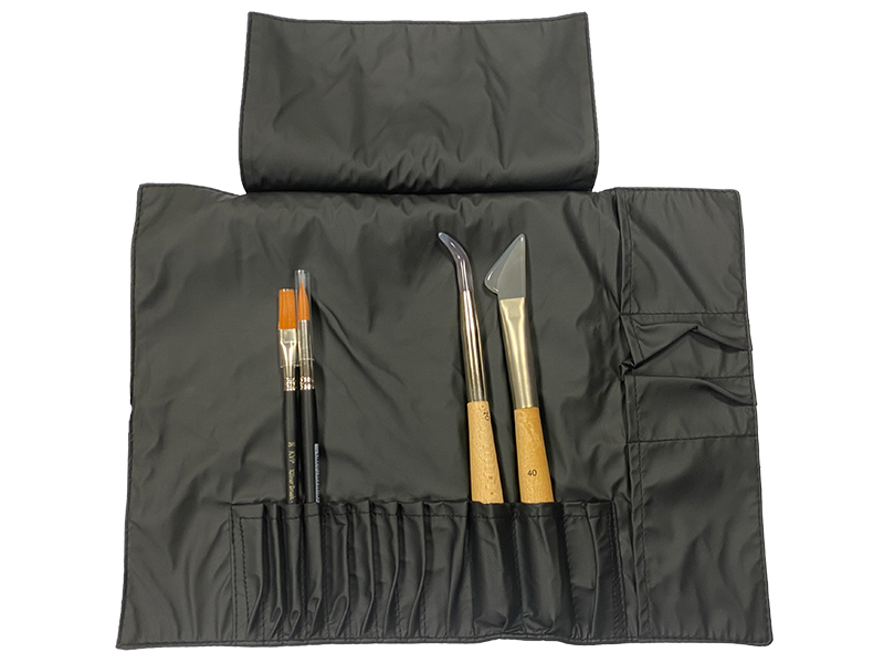 De bescherm hoesje heeft ruimte voor 4 agaat stenen en een aantal penselen.