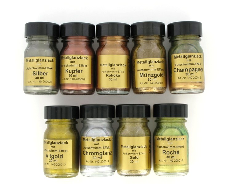 De metaalglanslakken zijn verkrijgbaar in verpakkingen van 30 ml.. Munzgold lijkt het meest op warm bladgoud, daarom is alleen deze kleur ook in 125 ml. verkrijgbaar. De totale collectie bestaat uit 9 kleuren.