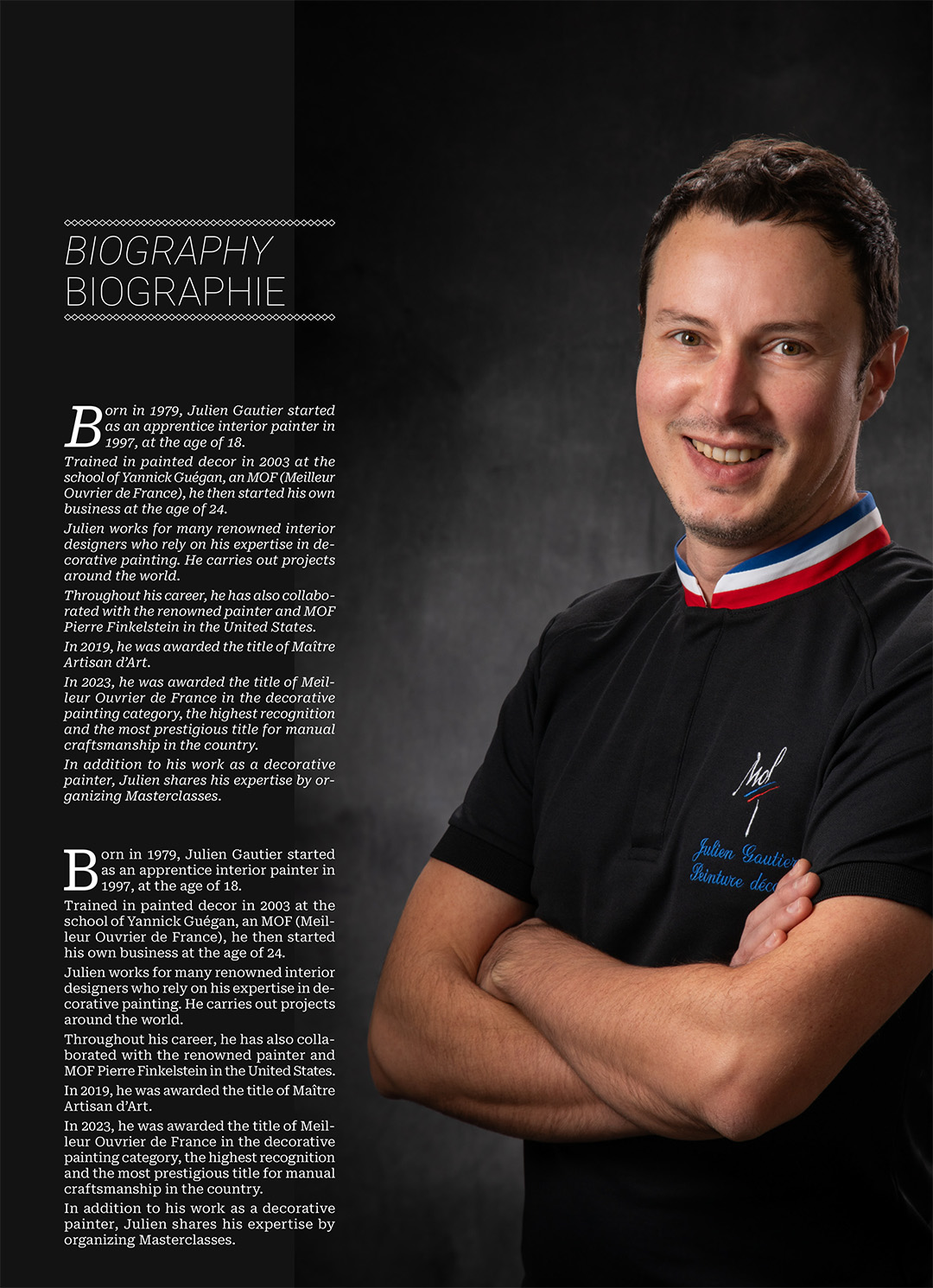 30 Step-by-Step Panels Using a Water-Based Technique Julien Gautier, Decorative Painter - Master Artisan - Awarded MOF (Meilleur Ouvrier de France) in 2023, will teach you in this book traditional marbling techniques using today’s products.