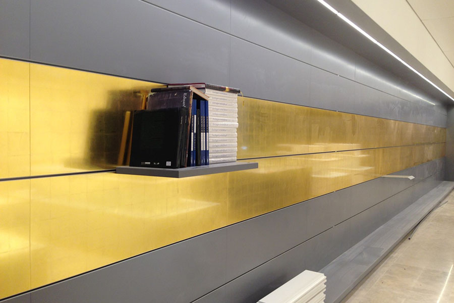 Voor een interieur kan het wel zeker een optie zijn een vernislaag of zelfs een coating aan te brengen. Denk hierbij aan oppervlakken die aan slijtage onderhevig zijn of die steeds schoongemaakt moeten worden. Een mooi voorbeeld is een tafelblad in het bladgoud. Als hier geen beschermende laag wordt aangebracht zou het bladgoud zeer snel beschadigen en afslijten. Bij bladgoud soorten onder de 20 karaat adviseren wij voor binnen ook een vernislaag. Leaf Protect van Kölner is speciaal ontwikkeld om bladmetalen te beschermen tegen het ontstaan van oxidatie. Leaf Protect is ook prima tegen aanraking en vervuiling, echter wordt een oppervlak zwaarder belast dan moet er een heldere slijtvaste vernis of coating worden aangebracht. Leaf Protect kan dan als isolatielaag dienen alvorens deze coating wordt aangebracht. Een blanke polyurethaan of epoxycoating volstaat over het algemeen. Ook hier zijn risico’s aan verbonden indien de inwerking van agressieve oplosmiddelen plaatsvindt. Maak altijd een proefvlak met de volledige opbouw van de vergulding en het aanbrengen van de coating.